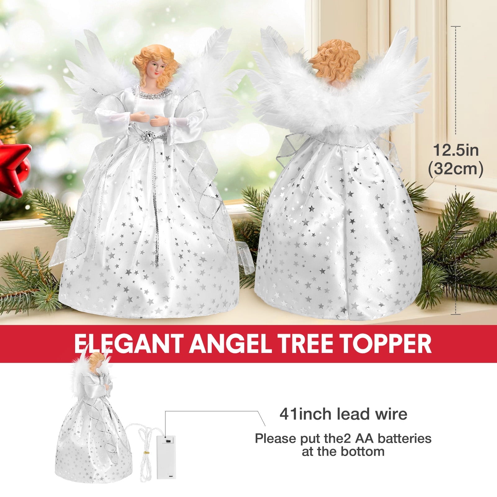 - Lighted Feature: Measuring approximately 12.5 x 7.8 inches, this lightweight angel tree topper includes an LED bulb that lights up from the inside, emitting a soft, warm ivory glow.